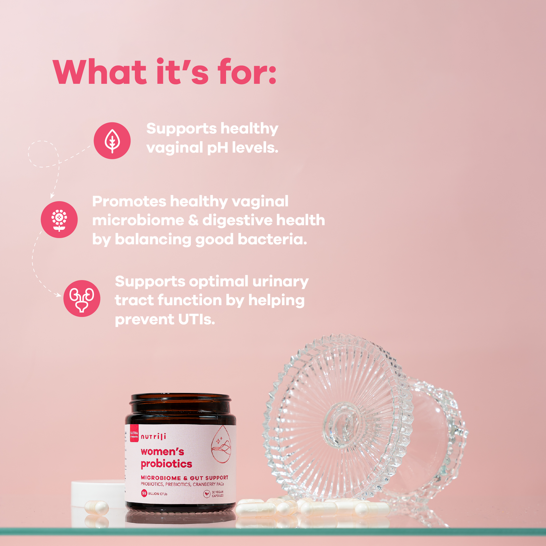 Your body is home to a vast community of trillions of microorganisms, including 38 trillion bacteria living in and on you. These microbes—part of what's known as the microbiome—play essential roles in digesting food, managing inflammation, and producing vital vitamins, neurotransmitters, and metabolites. Nutrili™ Women's Probiotics is a daily supplement combining probiotics and prebiotics designed to support vaginal health, immune balance, and gut health. Formulated specifically as digestive probiotics for women, it helps promote probiotics for women’s digestive health while also supporting probiotics for pH balance—important for maintaining a healthy vaginal environment. Nutrili™ is ideal for women ages 18 and up looking for whole-body wellness rooted in microbiome support.